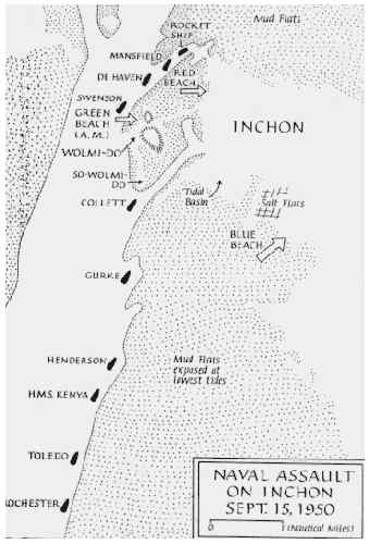 The MANSFIELD, flagship of Commander Destroyer Squadron NINE, was one of six (6) destroyers selected for the reconnaissance in force of Inchon Harbor on 13 and 14 September 1950. The ship had been employed in blockade and shore bombardment of the enemy coast of Korea from 25 June until 8 September 1950. The ship was assigned to Task Force 90 (Fire Support Group) on 12 September, following three (3) busy days in port for replenishment and indoctrination of the planned assault.